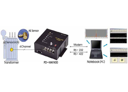 PD-MAT400是一种固定式四通道局部放电(PD)在线监测装置,用于电力变压器、断路器、 GIS及其他高电压设备内局部放电信号的检测及分析。 PD-MAT400系统设有四个超声波AE传感器,使用时可将传感器固定于设备外部以检测局放信号,最多允许32套系统以RS-422总线方式相互连接。 此外,PD-MAT400的系统软件也支持调制解码器或RS485通讯方式,以图形方式实时显示局部放电波形及其特征量。
